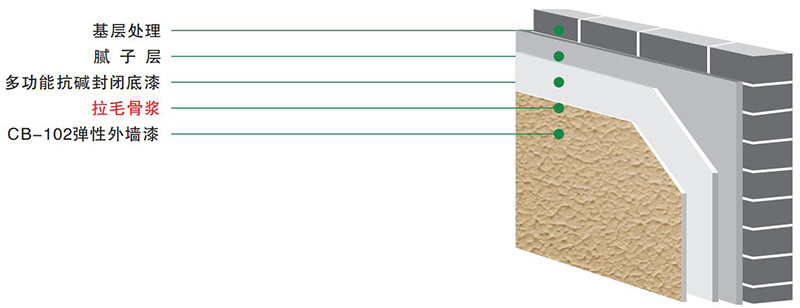 底漆:梨樹(shù)園多功能抗堿底漆一遍。面漆:CB-102彈性外墻漆二遍滾涂、刷涂或無(wú)氣噴涂。