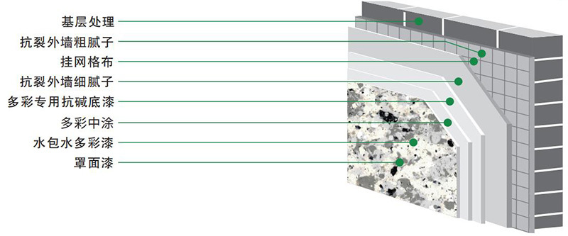 建議配套產(chǎn)品:多彩專用抗堿底漆一遍,多彩中涂一遍,多彩漆兩遍(建議涂裝道數(shù)),專用罩光面漆一遍。