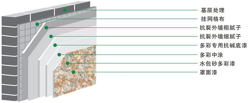 建議配套產(chǎn)品:多彩專用抗堿底漆一遍,多彩中涂一遍,多彩漆兩遍(建議涂裝道數(shù)),專用罩光面漆一遍。